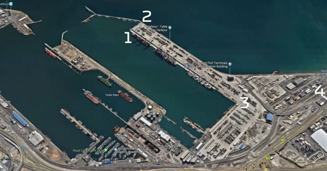We’ll briefly describe the port of Cape Town for those who are not familiar with it. On the left side of the image, general cargo and stores, berths and warehousing facilities can be seen. Between numbers 1 and 2, there is a container tanker. The fruit terminal can be found further to the right, around number 3. A large refrigerated storing facility for fruits, which is one of the primary commodities traded at the Cape Town port.