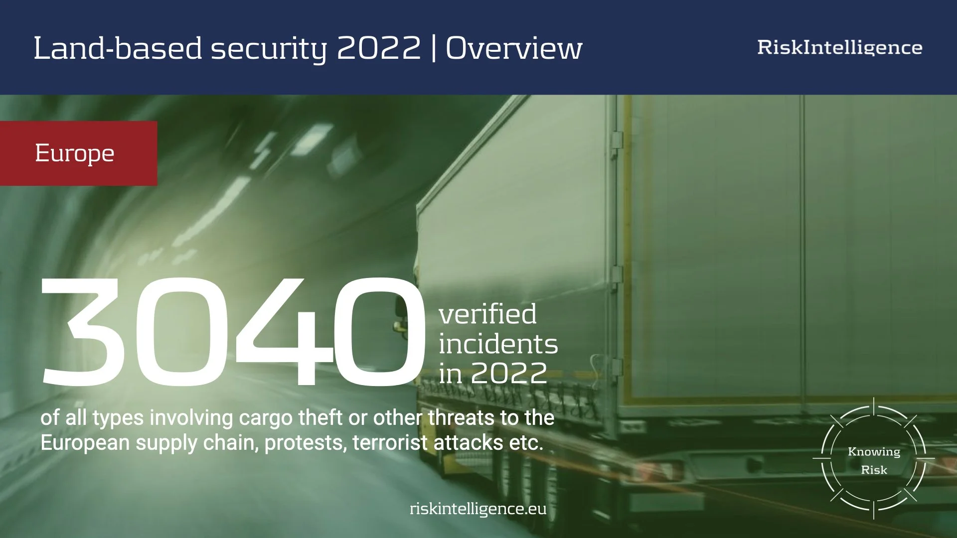 Cargo Theft incidents and other threats of all kinds posed a continuous threat to European supply chains in 2022. Risk Intelligence have recorded over 3,000 incidents in Europe (including theft attempts) where we have been able to report what happened and provide an accurate location regarding where the crime took place. These incidents involve cargo theft or other threats to the supply chain, significant protests, terrorist attacks etc., and have all been logged on LandRisk Logistics with verified information, accurate location, images, incident analysis and supporting details.