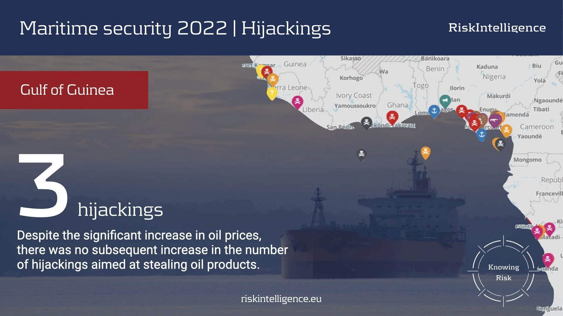 Merchant ships were hijacked in three incidents during 2022. One vessel was hijacked twice with refined oil products reportedly stolen on both occasions. Some observers have noted these incidents with concern, noting that such attacks could become more frequent again due to comparatively high oil prices.