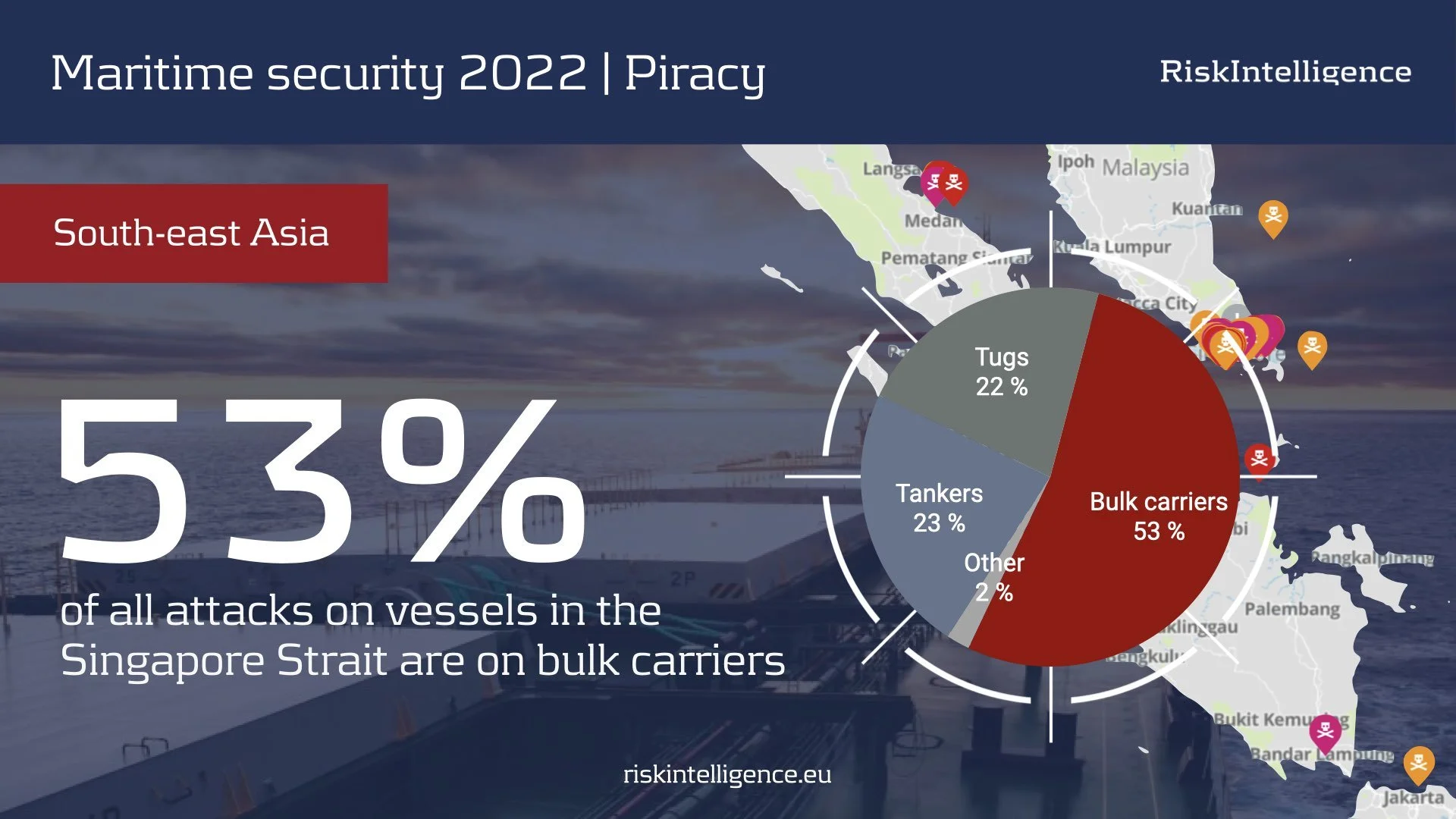 The Singapore Strait is the site of 63% of all recorded incidents within Southeast Asia. Despite the 8% increase of attacks, 55% are failed, indicating that an aware crew is an effective deterrent. No container vessels were boarded in the strait in 2022.